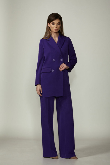Брючный комплект из костюмной ткани на подкладке. Двубортный жакет выполнен в стиле оверсайз. Воротник-с отложными лацканами пиджачного типа, рукава – двухшовные. По переду- прорезные карманы с клапанами. Жакет имеет два ряда пуговиц, застегивается на две основные пуговицы, одну потайную, остальные пуговицы несут декоративный характер. Брюки прямые со складкой, широким поясом-обтачкой, наклонными карманами. Застегиваются на молнию по переду и пуговицу.