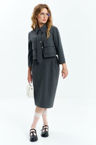 Комплект из костюмной ткани на подкладке, состоящий из жакета и юбки. Жакет приталенного силуэта с прорезными карманами с клапанами по переду. Воротник-английский, рукава - двухшовные. Застегивается на две пуговицы.  На лацкане жакета - цветок ручной рабоы. Юбка на подкладке, слегка зауженная к низу, без пояса. Верх юбки обработан обтачкой. Шлица в среднем шве заднего полотнища юбки обеспечит свободу движения. Застежка - молния в среднем шве юбки.