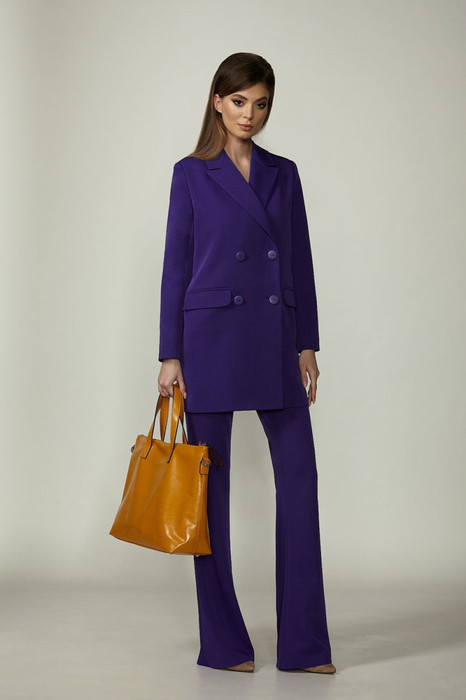Брючный комплект из костюмной ткани на подкладке. Двубортный жакет выполнен в стиле оверсайз. Воротник-с отложными лацканами пиджачного типа, рукава - двухшовные. По переду- прорезные карманы с клапанами. Жакет имеет два ряда пуговиц, застегивается на две основные пуговицы, одну потайную, остальные пуговицы несут декоративный характер. Брюки-клеш с началом расширения от колена. Брюки с двумя карманами округлой формы и поясом-обтачкой. Застегиваются на молнию по переду и одну пуговицу.