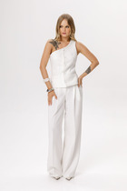 Классический брючный комплект из костюмной ткани на подкладке. Жакет приталенного силуэта с прорезными карманами с клапанами по переду. Воротник-английский, рукава - двухшовные. На лацкане- цветок ручной работы. Застегивается на две пуговицы. Брюки-клеш с началом расширения от колена. Брюки с двумя карманами округлой формы и поясом-обтачкой. Застегиваются на молнию по переду и одну пуговицу.