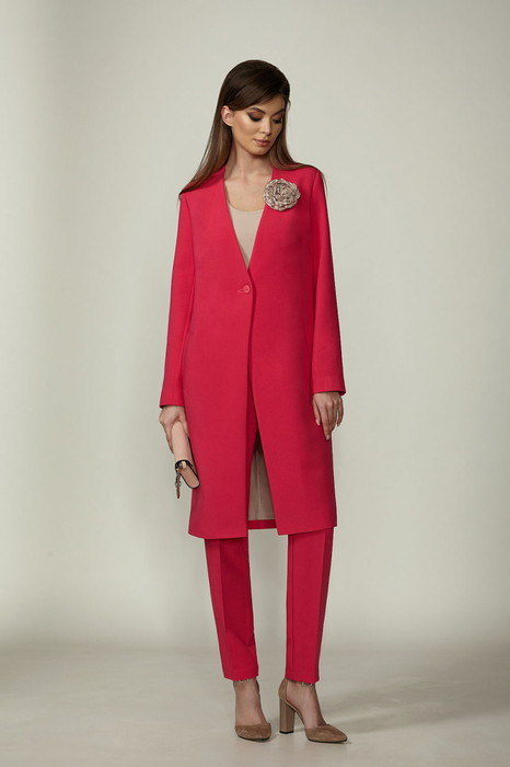 Брючный комплект из костюмной ткани на подкладке.  Жакет прямого силуэта с двумя наклонными вытачками и карманами в боковых швах. Рукава - длинные, двухшовные. Жакет застегивается на 1 пуговицу. Брюки слегка заужены к низу, с двумя наклонными карманами и поясом.  Застегиваются на молнию по переду и  одну пуговицу.