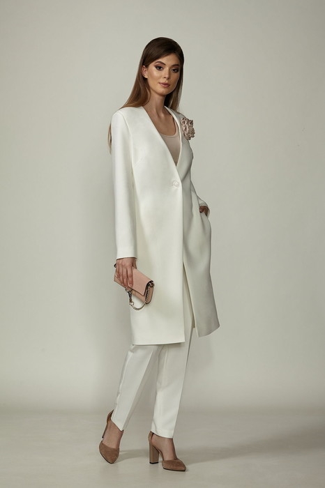 Брючный комплект из костюмной ткани на подкладке.  Жакет прямого силуэта с двумя наклонными вытачками и карманами в боковых швах. Рукава - длинные, двухшовные. Жакет застегивается на 1 пуговицу. Цветок ручной работы  в виде пиона станет украшением комплекта.  Брюки слегка заужены к низу, с двумя наклонными карманами и поясом.  Застегиваются на молнию по переду и  одну пуговицу.
