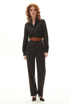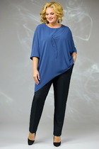 Брючный комплект из костюмной ткани на подкладке. Двубортный жакет выполнен в стиле оверсайз. Воротник-с отложными лацканами пиджачного типа, рукава – двухшовные. По переду- прорезные карманы с клапанами. Жакет имеет два ряда пуговиц, застегивается на две основные пуговицы, одну потайную, остальные пуговицы несут декоративный характер. Изюминка комплекта - декоративная булавка розового цвета. Брюки прямые со складкой, широким поясом-обтачкой, наклонными карманами. Застегиваются на молнию по переду и пуговицу.