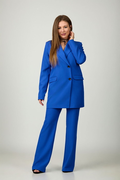 Брючный комплект из костюмной ткани на подкладке. Жакет двубортный.  Воротник-с отложными лацканами пиджачного типа, рукава - двухшовные. По переду- прорезные карманы  с клапанами. Жакет  застегивается на две основные пуговицы, одну потайную.  Брюки-клеш плотно сидящие по фигуре,  расширены к низу,  начало расширения выше колена 5 см. Брюки с двумя карманами округлой формы и поясом-обтачкой.  Застегиваются на молнию по переду и  одну пуговицу.