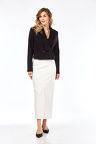 Юбка на подкладке, слегка зауженная к низу, без пояса. Верх юбки обработан обтачкой. В рельефе юбки разрез, обеспечивающий свободу движения и щель, декорированная булавкой. Застежка - молния в среднем шве юбки сзади.