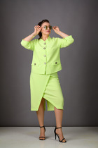 Новинка на весну - комплект на подкладке из стрейчевой ткани с эффектом креша салатового цвета!  Только представьте, как изысканно вы будете смотреться в этом стильном изделии! Жакет прямого силуэта с воротником-стойкой и карманами с клапанами. Рукава-реглан, трехчетвертные. Застежка на пуговицы. Юбка с запахом, немного зауженная к низу, с поясом с резинкой. В среднем шве-молния и шлица.