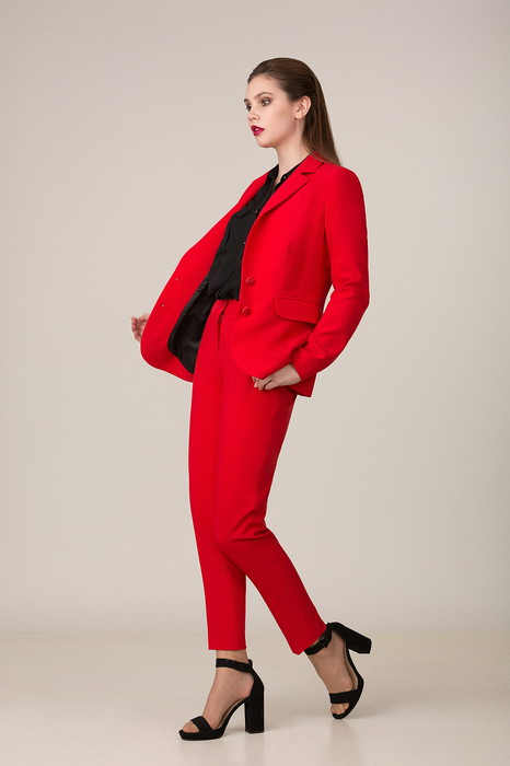 Классический брючный костюм из костюмной ткани на подкладке. Жакет приталенного силуэта с прорезными карманами с клапанами по переду. Воротник-английский, рукава - двухшовные. Застегивается на две пуговицы.  Брюки слегка заужены к низу, с двумя наклонными карманами и поясом.  Застегиваются на молнию по переду и  одну пуговицу. Длина жакета по спинке 67 см, длина рукава 63 см, длина брюк 99 см.