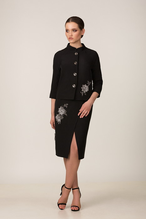 Комплект из плательной ткани на подкладке, состоящий из жакета и юбки. Жакет прямого силуэта с двумя нагрудными вытачками. Воротник - стойка. Рукав трехчетвертной. Жакет застегивается на 4 пуговицы.  Юбка на запах, слегка зауженная к низу, с поясом.  Настрочные аппликации   в нижних частях жакета и юбки делают его элегантным. Юбка застегивается на пуговицы. Длина жакета 58см, длина рукава 58см (с плечом). Длина юбки 71 см.