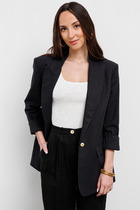 Классический брючный костюм из костюмной ткани на подкладке. Жакет приталенного силуэта с прорезными карманами с клапанами по переду. Воротник-английский, рукава - двухшовные. Застегивается на две пуговицы. Брюки слегка заужены к низу, с поясом. Застегиваются на молнию по переду и одну пуговицу. Кант из серебряной кожи по краю борта, клапанам и боковым швам брюк добавит стиля и элегантности. Длина жакета по спинке 67 см, длина рукава 63 см, длина брюк 99 см.