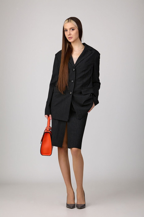 Комплект, состоящий из жакета и юбки  из костюмной ткани на подкладке.  Жакет с расширенной линией плеч, с отрезными бочками по переду и спинке и вытачками по переду. Воротник-с отложными лацканами пиджачного типа. По переду - прорезные  карманы  с клапанами. Рукава длинные, двухшовные. Жакет застегивается на три пуговицы. Юбка прямая с наклонными карманами и разрезом по переду , с широким поясом-обтачкой. Застегиваются на молнию сзади.
