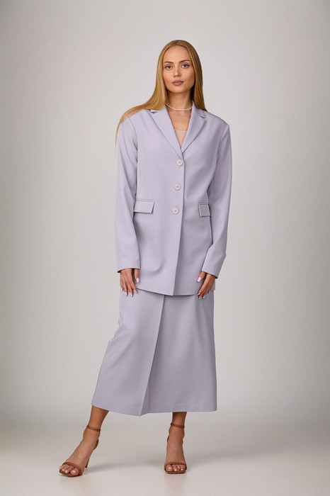 Комплект-двойка, состоящий из пиджака и юбки.  Пиджак из костюмной ткани на подкладке с расширенной линией плеч, с отрезными бочками по переду и спинке и вытачками по переду. Воротник-с отложными лацканами пиджачного типа. По переду - прорезные  карманы  с клапанами. Рукава длинные, двухшовные. Пиджак  застегивается на три пуговицы. Юбка - миди с наклонными карманами и складкой по переду, с широким поясом-обтачкой. Застегиваются на молнию спереди и пуговицу.