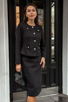 Комплект женский на подкладке из джинсовой ткани. Жакет прямого силуэта, по переду нагрудные вытачки и объемные карманы-портфели с клапанами. Пройма спущена, рукава узкие. Воротник с притачной стойкой. Застегивается на 4 пуговицы. Юбка - миди с наклонными карманами и складкой по переду, с широким поясом-обтачкой. Застегиваются на молнию спереди и пуговицу.