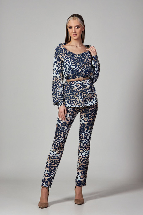 Комплект, состоящий из блузы и брюк. Блуза выполнена из тонкой шелковистой ткани. Пройма спущена, рукава - длинные с широкими манжетами. Роскошный воротник добавит яркости образу. Блуза застегивается на пришивные кнопки. Брюки из костюмной стрейчевой ткани, с двумя карманами и поясом-обтачкой. Застегиваются на молнию по переду и пуговицу. Комплект можно разнообразить поясами разного цвета. Пояс в комплект не входит.