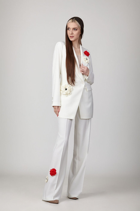 Брючный комплект из костюмной ткани на подкладке. Двубортный жакет полуприталенного силуэта с отрезными бочками и вытачками по переду и спинке. Воротник-с отложными лацканами пиджачного типа. По переду - прорезные  карманы  с клапанами. Рукава длинные, двухшовные. Жакет застегивается на две пуговицы. Жакет декорирован цветами-брошами ручной работы. Брюки прямые со складкой, широким поясом-обтачкой, наклонными карманами. Застегиваются на молнию по переду  и пуговицу.