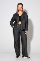 Джемпер женский из трикотажной ткани,прямого силуэта. По переду джемпера расположены настрочные карманы. Спинка прямая. Спущенное плечо .Рукав 3/4. Вырез горловины треугольный. Застежка двухбортная на петлях-пуговицах.