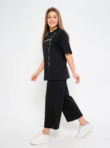 Костюм из кулирки футболка + шорты. Три расцветки — желтая, персиковая и розовая. Принт на футболке в виде изображения головы кошки и надписи, черная окантовка рукавов и горловины. Черные шорты с карманами по бокам. Размеры от 44 до 54.