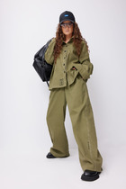 Брюки заужены книзу. Передние детали брюк с отрезными боковыми частями, в которых обработаны карманы. На задних деталях брюк обработаны накладные карманы. Пояс притачной на резинке по кругу.