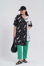 Брюки прямые, зауженные к низу, верх брюк обработан притачным поясом с резинкой по спинке. По переду карманы с отрезными бочками. Застёжка на тесьму-молнию, петлю и металлическую пуговицу на поясе.