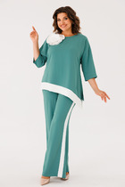 Комплект женский, 3х предметный, состоящий из жилета, свитшота и брюк. Жилет выполнен из плащевой ткани, стеганой на синтепоне, на подкладке. По переду прорезные карманы с листочкой. Застежка центральная на кнопки. Горловина оформлена капюшоном с кулисой по краю. Спинка без особенностей. Свитшот прямого силуэта с длинным, втачным рукавом. Рукав с рельефами и декоративной заплаткой на локте. По низу манжета. Перед задекорирован вышивкой. Вырез горловины круглой формы с подрезной бейкой. По спинке горизонтальный подрез. Брюки прямые, длинные. Спереди наклонные карманы. Пояс притачной, с резинкой по кругу и декоративной кулисой.