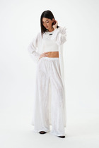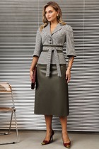 Комплект женский, 2х предметный, состоящий из джемпера и брюк. Комплект выполнен из двух видов трикотажного полотна и отделойной текстильной ткани. Джемпер прямого силуэта с длинным рукавом. Рукав со спущенной линией плеча, снизу на манжете. По переду и спинке горизонтальный подрез, со сменой ткани и отделочной нашивкой спереди. По рукаву вставка треугольной формы из отделочной ткани. Горловина круглой формы с подрезной бейкой. Низ присобран на регулируемую кулису. Брюки прямые, свободные, по низу на манжете, частично с резинкой. По бокам вставки треугольной формы из отделочной ткани. Спереди функциональные карманы. Пояс притачной, с резинкой сзади и частично по переду.