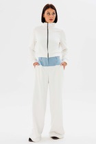 Комплект женский, 2х предметный, состоящий из куртки и брюк, из стежки и трикотажного полотна. Куртка прямого силуэта, по низу на манжете. Перед и спинка выполнены из стеганной на синтепоне, с подкладкой, принтованной текстильной ткани. Карманы в боковых швах. Рукав втачной, длинный, по низу на манжете. Горловина оформлена капюшоном с кулисой. Застежка центральная на тесьму "молния". Брюки широкие, прямые. По боку подрезной лампас с отделочной строчкой и карманы. По центру переда прострочены защипы ("стрелка") Капюшон, рукава, манжет низа куртки и брюки из трикотажного полотна.