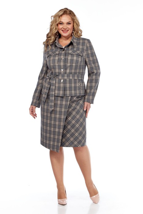 Женский комплект-двойка, состоящий из жакета и юбки в клетку — идеальное решение для деловых и повседневных образов. Жакет прямого силуэта с центральной застёжкой на 4 петли и пуговицы. На переде обработаны нагрудные вытачки, внутренние карманы с листочками, накладные карманы с клапанами. Спинка со средним швом. Рукав втачной, двухшовный, длинный. Воротник стояче-отложной с отрезной стойкой. Съёмный пояс идёт в комплекте.