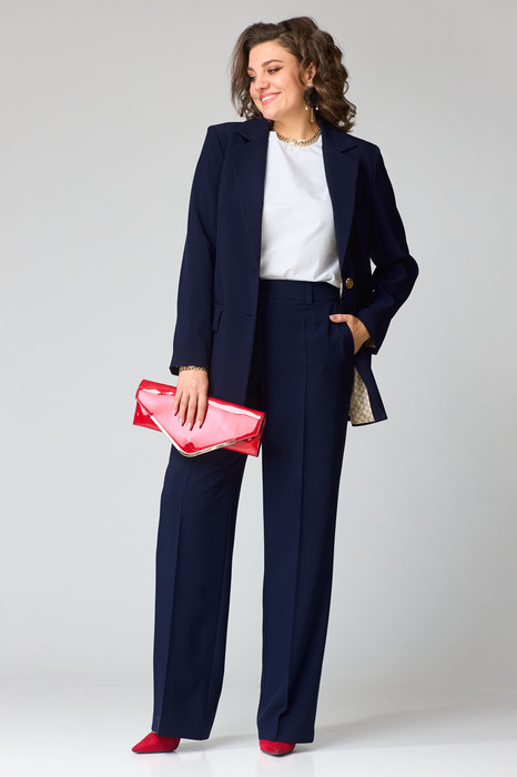 Элегантный костюм-тройка, состоящий из жакета, футболки и брюк. Жакет и брюки выполнены из костюмной ткани, футболка — из трикотажного полотна. Жакет прямого силуэта, с застежкой на две петли и две пуговицы. Перед жакета с нагрудной вытачкой, с прорезными карманами в рамку с клапаном. Спинка жакета со средним швом, заканчивающийся шлицей, левая часть спинки с прорезным карманом в рамку, вход в который фиксирует навесная петля с пуговицей. Рукава двухшовные втачные. Горловина оформлена воротником пиджачного типа. Белая футболка прямого силуэта  со спущенной линией плеча и втачным рукавом. Горловина обработана трикотажной бейкой из основной ткани. Брюки классической формы, прямого силуэта, со стрелками по передним и задним половинкам. Верхний срез обработан обтачным поясом. На задних половинках расположены талиевые вытачки, с декоративными листочками. В боковых швах брюк - наклонные карманы. Застёжка центральная на тесьму молнию и крючок.