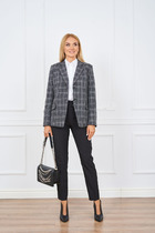 Костюм женский 3-х предметный, состоящий из жакета, брюк и джемпера. Жакет выполнен из поливискозы с принтом "клетка". Жакет полуприлегающего силуэта, на подкладке, с двухбортной застежкой на петли и пуговицы. Горловина жакета оформлена воротником пиджачного типа. Воротник выполнен из отделочной ткани-компаньена. Рукава двухшовные длинные с возможностью подворота длины. Перед с нагрудными выточками, выходящими из рельефов. В области бедер обработаны прорезные карманы "в рамку" с клапаном. Спинка со средним швом и рельефами. Брюки прямого силуэта со стрелками по передним и задним половинкам. Выполнены из однотонной поливискозы. Верхний срез обработан притачным поясом. По центру переда - застёжка на крючок и тесьму-молнию. На задних половинках расположены талиевые вытачки и декоративные листочки. В боковых швах расположены наклонные карманы. Джемпер прямого силуэта, выполнен из 100% вискозы. Перед и спинка цельнокроенная. Рукав длинный. Горловина типа "водолазка". Длина изделия - середина бедра.