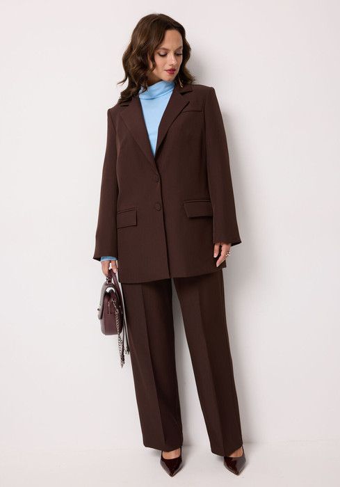 Элегантный костюм-тройка, состоящий из жакета, джемпера и брюк. Жакет и брюки выполнены из костюмной ткани, джемпер — из трикотажного полотна. Жакет прямого силуэта, с застежкой на две петли и две пуговицы. Перед жакета с нагрудной вытачкой, с прорезными карманами в рамку с клапаном. Спинка жакета со средним швом, заканчивающийся шлицей, левая часть спинки с прорезным карманом в рамку, вход в который фиксирует навесная петля с пуговицей. Рукава двухшовные втачные. Горловина оформлена воротником пиджачного типа. Брюки классической формы, прямого силуэта, со стрелками по передним и задним половинкам. Верхний срез обработан обтачным поясом. На задних половинках расположены талиевые вытачки, с декоративными листочками. В боковых швах брюк - наклонные карманы. Застёжка центральная на тесьму молнию и крючок. Джемпер прямого силуэта, выполнен из вискозы. Перед и спинка цельнокроенная. Рукав длинный. Горловина типа "водолазка". Длина изделия - середина бедра.