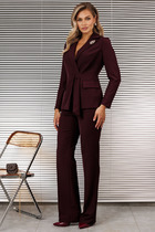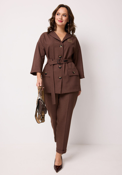 Костюм женский 2-х предметный, состоящий из жакета и брюк. Жакет выполнен из поливискозы, без подкладки. Жакет прямого силуэта, с цельнокроенным рукавом, с центральной застежкой на петли и пуговицы. Перед с нагрудными вытачками, в области груди - декоративная нашивка. По переду в области бедер обработаны прорезные карманы с листочками и клапанами, на которых пришиты декоративные пуговицы. Спинка со средним швом и талиевыми вытачками. Рукава одношовные, с цельнокроенными манжетами. В комплект входит съёмным пояс из основной ткани с Д-пряжкой и нашивкой. Брюки выполнены из полизивкозы, прямого силуэта со стрелками по передним и задним половинкам. Верхний срез обработан притачным поясом. По центру переда - застёжка на крючок и тесьму-молнию. В области боковых швов вставлена резинка. На задних половинках расположены талиевые вытачки. В боковых швах расположены наклонные карманы. Низ брюк с цельнокроенными манжетами.