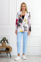Костюм состоит из жакета и брюк. Качественная поливискоза, из которой выполнена модель, обеспечит долговечность изделию и приятные ощущения его обладательнице. Жакет без подкладки прямого силуэта, с двубортной застежкой на петли-пуговицы, длиной до середины бедра. Перед жакета с нагрудными вытачками, в области груди расположена декоративная листочка. Спинка с двойной кокеткой, в шве притачивания которой обработана встречная складка. Низ жакета фигурный, с закруглениями по боковым швам. Рукава двушовные, длиной 3/4, по низу с манжетой, застегивающейся на петлю и пуговицу. Горловина оформлена воротником пиджачного типа. Брюки классической формы, прямые от линии бедер, со стрелками по передним и задним половинкам. Верхний срез обработан поясом, в который от бокового шва вставлена резинка по задним половинкам. В боковых швах обработаны наклонные карманы. На задних половинках расположены талиевые вытачки. В комплект входит пояс из основной ткани.