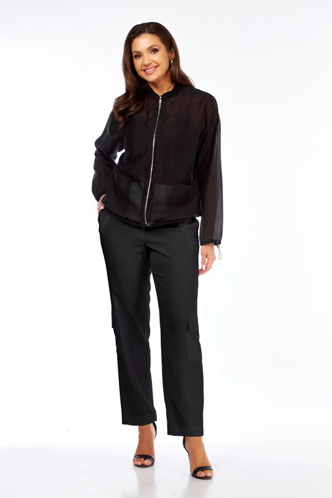 Комплект женский двухпредметный, состоящий из легкой блузы из вуаля и брюк. Блуза свободного кроя с центральной боковой застежкой на тесьму-молнию и двумя накладными карманами. Изделие со слегка спущенной линией плеча. Воротник - стойка. Рукав одношовный втачной длинный. Низ изделия по низу с притачной резинкой. Низ рукава с кулиской на петлю и фиксатор с тонкой резинкой. Брюки с притачным поясом сзади на резинке, классического кроя. Заужены к низу, с боковыми накладными карманами с притачным декором. Брюки с наклонным к боковому шву карманом. Застежка на тесьму-молнию и одну петлю-пуговицу по поясу.