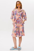 Жакет без подкладки с центральной бортовой застежкой на 3 петли-пуговицы до линии перегиба лацкана и с двумя горизонтальными подрезами по спинке и переду. В нижнем подрезе переда обработаны карманы "в шве". На правой верхней части переда настрочена декоративная нашивка. По подрезам проложена контрастная отделочная строчка. Воротник пиджачного типа. Рукав короткий одношовный с центральной широкой манжетой с отделочной строчкой.