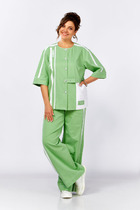 Костюм женский двухпредметный, состоящий из жакета и брюк. Жакет полуприлегающего силуэта, удлиненный, с центральной бортовой застежкой на 2 петли-пуговицы до линии перегиба лацкана. Перед с нагрудными вытачками, выходящими из горловины. Боковые швы с разрезами, между которыми по спинке вставлен пояс фигурной формы с декоратичной нашивкой. Спинка со средним швом. Воротник пиджачного типа. Рукава втачные двухшовные длиной 3/4. Брюки палаццо с притачным широким поясом на резинке от заутюженных стрелок по передней половинке вкруговую. Застежка на тесьму-молнию в средних срезах передних половинок брюк и 2 петли-пуговицы по поясу.