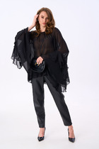 Костюм женский двухпредметный, состоящий из жакета и брюк. Жакет полуприлегающего силуэта с центральной бортовой застежкой на тесьму-молнию, с фигурными бочками. Спинка со средним швом. Вырез горловины V-образной формы. Рукава втачные длинные двухшовные. Брюки-палацо с притачным поясом, сзади на резинке. Застежка на тесьму-молнию в средних срезах передних половинок брюк и 1 петлю-пуговицу. В изделии обработаны карманы, наклонные к боковому шву. На брюках заутюжены стрелки.
