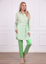 Костюм женский двухпредметный, состоящий из жакета и юбки. Жакет полуприлегающего силуэта со слегка спущеной линией плеча, на подкладке, со смещенной застежкой на 3 пели-пуговицы по линии борта 1 потайной петлей-пуговицей и нагрудными вытачками, выходящими из боковых швов. Горловина с фигурной планкой по переду и спинке. Спинка со средним швом. Рукав втачной длинный двухшовный. Изделие со съемным поясом. Юбка- карандаш длиной за колено, зауженная к низу, с кокетками со шлевками. Переднее полотнище с имитацией карманов и рельефным швом, заканчивающимся разрезом. Заднее полотнище со средним швом, в котором обработана застежка на 2 петли-пуговицы по кокетке и потайная тесьма-молния.