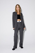 Брюки прямого силуэта с центральной застёжкой на молнию и петлю-пуговицу.