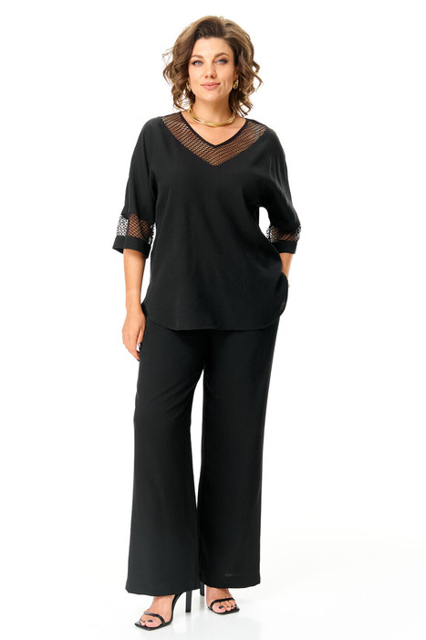 Комплект женский состоит из блузы и брюк. Блуза свободного покроя с рукавом типа "летучая мышь"длинною за линию локтя. Низ рукава с манжетой и вставкой из сетки. В боковых швах обработаны разрезы. Низ блузы разноуровневый с закругленными краями.По переду обработана кокетка из сетки.Горловина V-образной формы. Брюки свободные прямого силуэта. Пояс притачной на резинке.  боковых швах карманы.