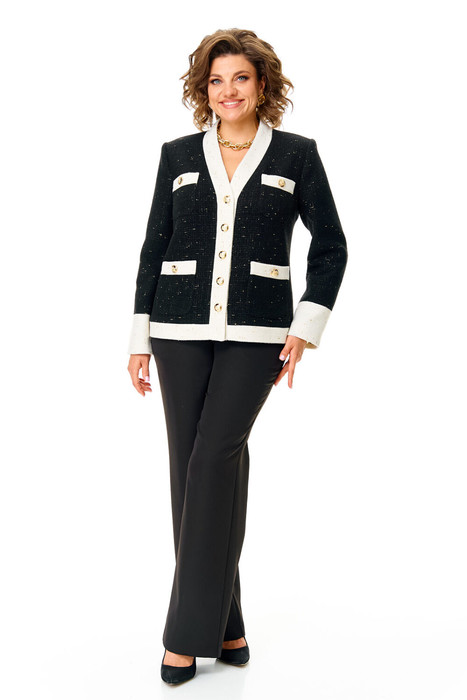 Жакет свободного покроя с естественной линией плеча на подкладке. Спинка со средним швом. Перед с нагрудными вытачками и накладными карманами.По переду обработана отрезная планка плавно переходящая в воротник стойку. Вырез горловина V-образной формы. Застежка центрально-бортовая на петли-пуговицы. Рукав двухшовный длинный с отрезной манжетой.