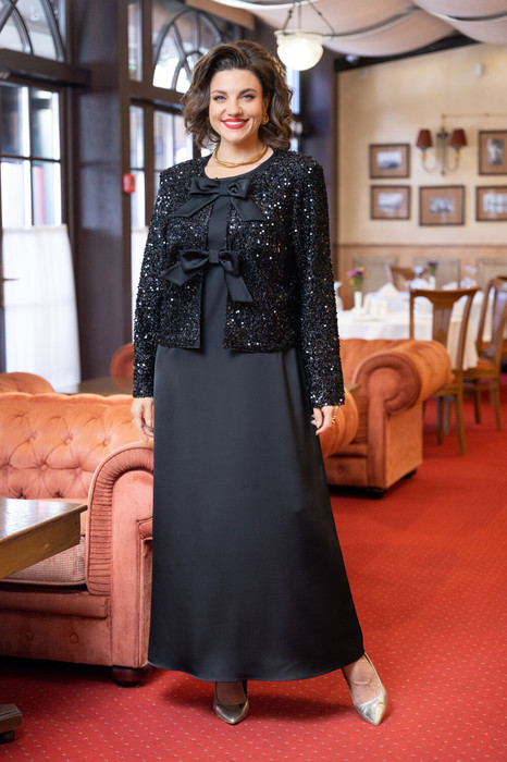Комплект женский состоит из укороченного жакета из полотна с пайетками и атласного платья.