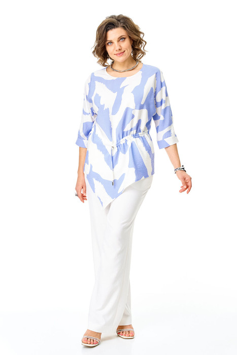 Блуза прямого свободного покроя. Рукав 3/4 типа "летучая мышь". Низ рукава со складками и отрезной манжетой с застежкой на петлю-пуговицу. По переду обработана кулиса, с втянутым шнуром с фиксатором и наконечниками. Низ переда ассиметричной формы с углом. Горловина округлой формы, окантована.