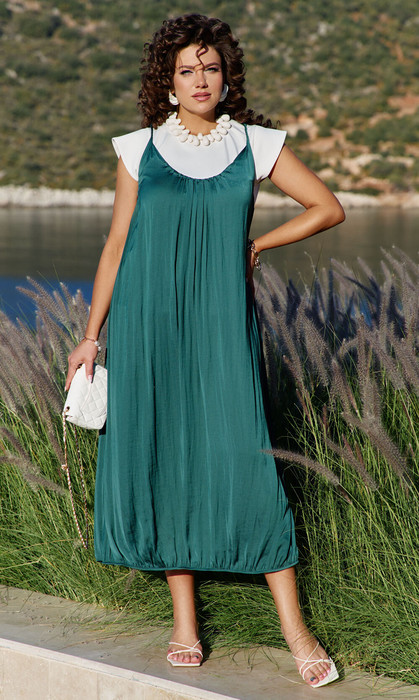 Комплект женский состоящий из блузы молочного оттенка и верхнего платья на бретелях, будто создан для того, чтобы приковывать к себе взгляды окружающих. Платье отлично подойдёт для жаркого летнего дня: будь то прогулка по пляжу, встреча с друзьями в кафе или свидание. Образ можно дополнить небольшой аксессуарами, чтобы предать образу завершённости. Легкий, летящий, буквально невесомый силуэт подчеркнет красоту вашей фигуры и скроет недостатки, а также станет отличным дополнением в Вашем гардеробе.
