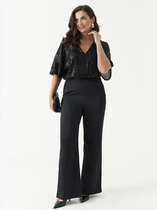 Костюм антично-белого оттенка и серебристой  нити с трендовым декором на левом плече. В крупные металлические люверсы проходят цепи и жемчужная нить. Жакет прямого силуэта с нагрудной вытачкой из низа и бочком. Застёжка однобортная на две петли и пуговицы с V-образной горловиной без воротника. Рукав полной длины двухшовный пиджачный. Спинка жакета с двумя талиевыми выточками. Юбка прямая зауженная к низу длины миди по переду комфортная шлица, задняя часть юбки со средним швом и потайной молнией в верхней части также талиевые вытачки. Юбка имеет приточной пояс по боковой части на резинке, что придает комфорт. Топ выполнен из лёгкой шелковистой ткани. Передняя часть топа имеет нагрудную вытачку, горловина округлой формы. Бретель топа достаточно широкая что скрывает недостатки. Длина жакета по спинке 55 см (р 48-52), 55,5 см (р 54-58), длина рукава 61,5 см. Длина топа по спине 63 см. Длина рукава топа 8 см.  Длина юбки 75 см (р 48-52), 76 см (р 54-58).                                              Жакет    48 50 52 54 56 58