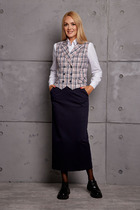 Комплект женский, состоящий из блузки и брюк. Блуза (состав: 61%район, 39%вискоза) выполнена из ткани с тонким шёлковым блеском - мерцает при движении. Блуза свободного силуэта с вырезом горловины в виде «лодочки». Спинка без особенностей. Низ ассиметричный с разрезами в боковых швах от низа. Рукав в блузе втачной на подкладке, в виде буфа, с залаженными декоративными складками по окату и низу. В комплекте идёт пояс из основной ткани. Брюки (состав: 60% полиэстер, 40% полиуретан) прямого силуэта из кожи с рельефами и отстрочкой по переду. По переду застежка на тесьму молнию в гульфике и пуговицу в поясе. По переду брюк наклонные карманы. Пояс притачной со вставкой эластичной тесьмы резинки в «бочках», что обеспечивает комфортную посадку на фигуру. Длина блузы 76,5 см (р 50-54), 77 см (р 56-60), длина рукава 37/45 см. Длина брюк по боковому шву от пояса 98 см.