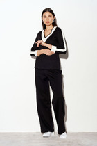 Блузка свободного силуэта с центральной потайной застёжкой на петли пуговице по планке, воротником рубашечного типа. В качестве дополнительного декоративного элемента по планке идет кант из отделочной ткани и декоративная брошь «цветок». Спинка в блузке со средним швом. Рукав втачной, длинный с заложенными складками по низу. По низу рукава манжета с застёжкой на петли пуговицы. Низ в блузке закруглённый, ассиметричный. Брюки свободного силуэта, широкие с притачным поясом на резинке для максимально удобной посадки на любой тип фигуры. Застежка на тесьму молнию в гульфике и пуговицу по центру переда. По переду брюк прорезные карманы. Пояс в брюках притачной.Длина блузки от высшей точки плечевого шва до низа 76,5 см(р.52-56), 77,5 см (р.58-62). Длина рукава от головины с плечом и манжетом 74 см(р.52-56), 75 см (р.58-62). Длина брюк по боковому шву от шва притачивания пояса 108 см.