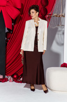 Комплект рождает образ женщины, которая умеет сочетать роскошь и стиль, держась на грани между ярким светом и глубоким шоколадом, между блеском и бархатной степенью. Женский комплект состоит из жакета, вся поверхность которого сияет золотистыми пайетками, а так блузы и юбки силуэта «рыбка» в модном цвете сезона—шоколаде. Жакет держит форму уверенно, линий строгих и чистых, но блеск металлика добавляет ему праздничности и состояния торжественности. Жакет (состав: 97% полиэстер, 3% спандекс, подкладка 100% полиэстер) однобортный, «оверсайз» силуэта, с акцентом на ровную линию плеч, с цельнокроеными отложными лацканами и потайной застёжкой на пришивные кнопки по краю борта. По переду жакета нагрудные вытачки и декоративные клапана карманов. Спинка в жакете со средним швом. Рукав в жакете втачной, одношовный, длинный. Жакет на подкладке. Под жакетом прячется топ, выполненный в более спокойной текстуре, чтобы не перегружать образ блеском. Он плавно повторяет линию декольте, поддерживая баланс между откровенностью и утонченностью. Блуза (состав: 100% полиэстер) прямого силуэта с округлой формой горловины и нагрудными вытачками по полочке. Юбка (состав: 100% полиэстер) длиной миди, силуэт рыбка, обнимает фигуру и плавно развеивается к низу, переходя в мягкое движение ткани. Шоколадный цвет юбки служит благородным фоном для пайеток жакета, подчеркивая контраст между матовым текстурным полем и ярким блеском декоративных элементов. Пояс в юбке притачной, со вставкой эластичной тесьмы резинки в задней части пояса. В боковом шве юбки застёжка на потайную тесьму - молнию и пуговицу в поясе. Длина жакета по спинке 71 см, длина рукава 62 см. Длина по спинке блузы 65 см, длина плеча 14 см (р 50-54), 14,5 см (р 56-60). Длина юбки 96 см.