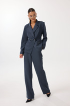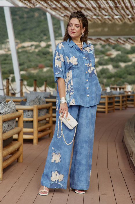 Костюм женский, двухпредметный, состоящий из блузки и брюк. Этот костюм — не про яркость, не про броскость, не про желание быть замеченным. Это про уверенность в себе, про понимание, что настоящая красота часто скрыта в деталях, это про комфорт каждый день. Костюм с идеальной посадкой подходит для образов как на каждый день, так и для особых случаев. Костюм выглядит сдержанно, почти монохромно, принт читается как тонкая деталь. Блузка свободного силуэта с центральной застёжкой на петли-пуговицы по планке, воротником рубашечного типа, По переду блузки накладные карманы, а также декоративные вставки из отделочной ткани с принтом. Линия плеча спущенная, рукав втачной, короткий с вставкой отделочной ткани с принтом. Спинка в блузке с отрезной кокеткой. В боковых швах от низа разрезы, для дополнительной динамики. Брюки прямого силуэта с притачным поясом на эластичной тесьме-резинке, что обеспечивает максимально удобную посадку на любой тип фигуры.  В боковых швах брюк карманы. По переду брюк от низа декоративные вставки из отделочной ткани с принтом. Принтованные элементы — это не просто украшение, это смысловые акценты, расставляющие точки над «i» в данной модели. Длина блузки 76 см (р 52-56), 77 см (р 58-62). Длина рукава 23 см (р 52-56), 23,5 см (р 58-62). Длина брюк 108 см.
