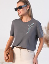 Костюм женский из трикотажного полотна "кулирка" в комбинации двух видов: гладкокрашеного и набивного с тематическим рисунком, состоящий из футболки и брюк. Футболка из гладкокрашеного полотна, классического покроя, с коротким втачными рукавами, горловиной овальной формы, обработанной втачной планкой и отделочной строчкой. В центре переда - принт, выполненгный в технике шелкографии. Брюки из полотна с набивным рисунком длинные, прямые, на притачном поясе с эластичной тесьмой внутри и карманами в боковыых швах.