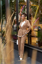 Костюм женский из трикотажного полотна "кулирка" в комбинации двух видов: гладкокрашенного и с рисунком в крупную клетку, сочетающихся между собой по цвету, состоящий из джемпера и брюк. Джемпер - из гладкокрашеного полотна, свободного покроя, с длинными втачными рукавами и приспущенными плечами, с горловиной овальной формы и тематическим принтом, выполненным в технике шелкографии. Горловина, нижние срезы рукавов и низ изделия обработаны подгибкой с отделочным широким кантом контрастного цвета. Брюки - из полотна в клетку, свободного покроя, прямые, на притачном поясе с эластичной тесьмой внутри, с карманами в боковых швах. Нижние срезы обработаны подгибкой.