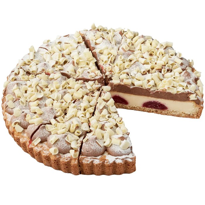 Современная интерпретация австрийской классики: торт на песочной основе с ароматной вишней и насыщенным шоколадным муссом, в качестве декора солирует белый шоколад.